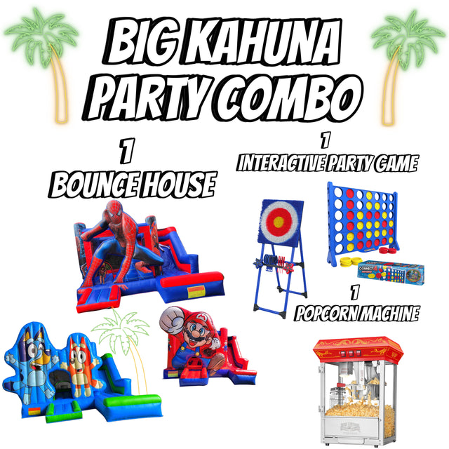 The Big Kahuna Party Combo is your all-in-one celebration setup! Designed for families who want a fun mix of jumping, games, and tasty treats, this package includes a bounce house, an interactive game, and a premium popcorn machine to keep the good times rolling.